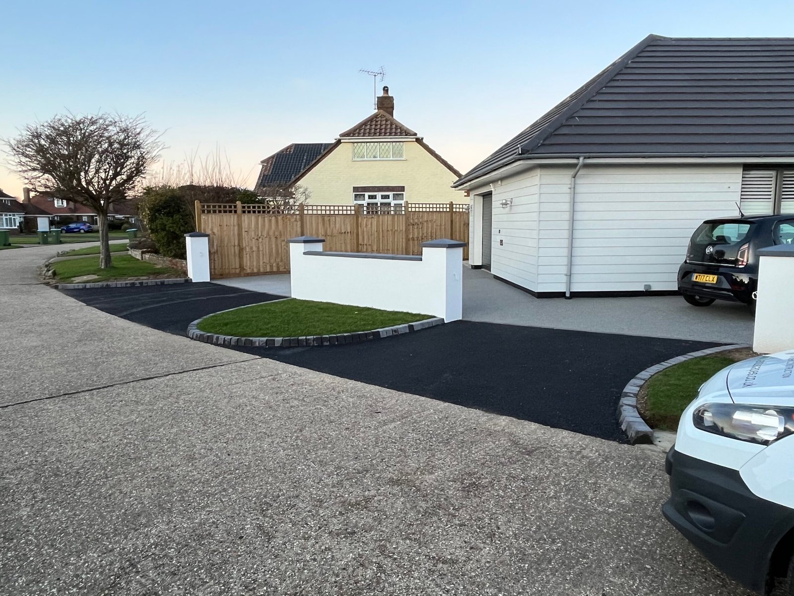 Resin bound driveway with tarmac crossovers, rendered piers and wall with block paving kerbs and turfing.