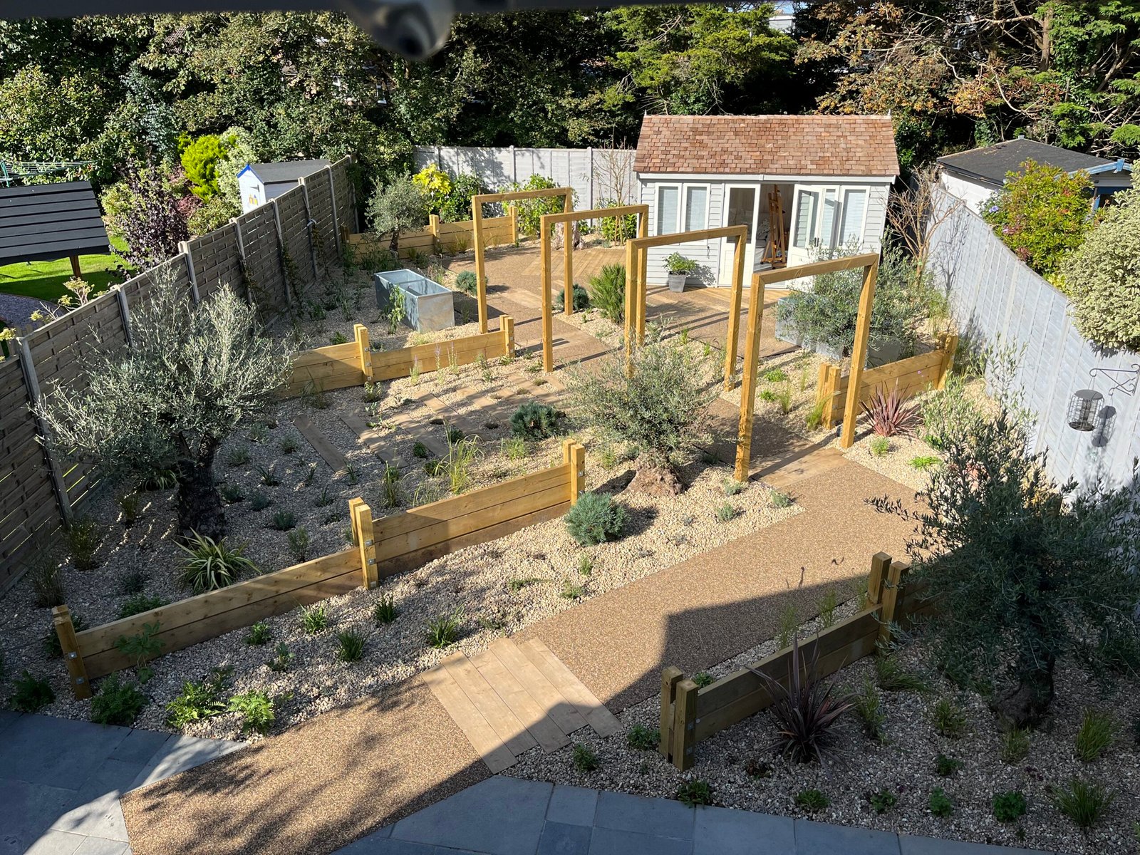 This house was near the sea so had a coastal theme, timber groins, resin path, beach shingle and pebbles, oak sleepers, planting and the olive trees